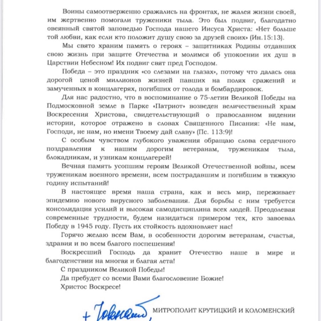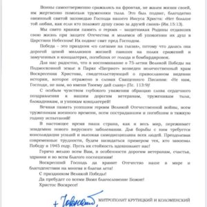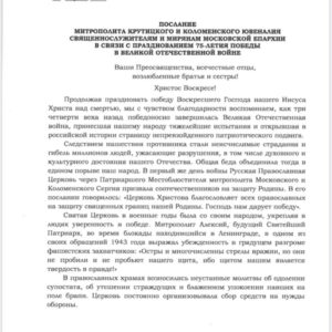 Обращение митрополита Крутицкого и Коломенского Ювеналия в связи с 75-летием Великой Победы