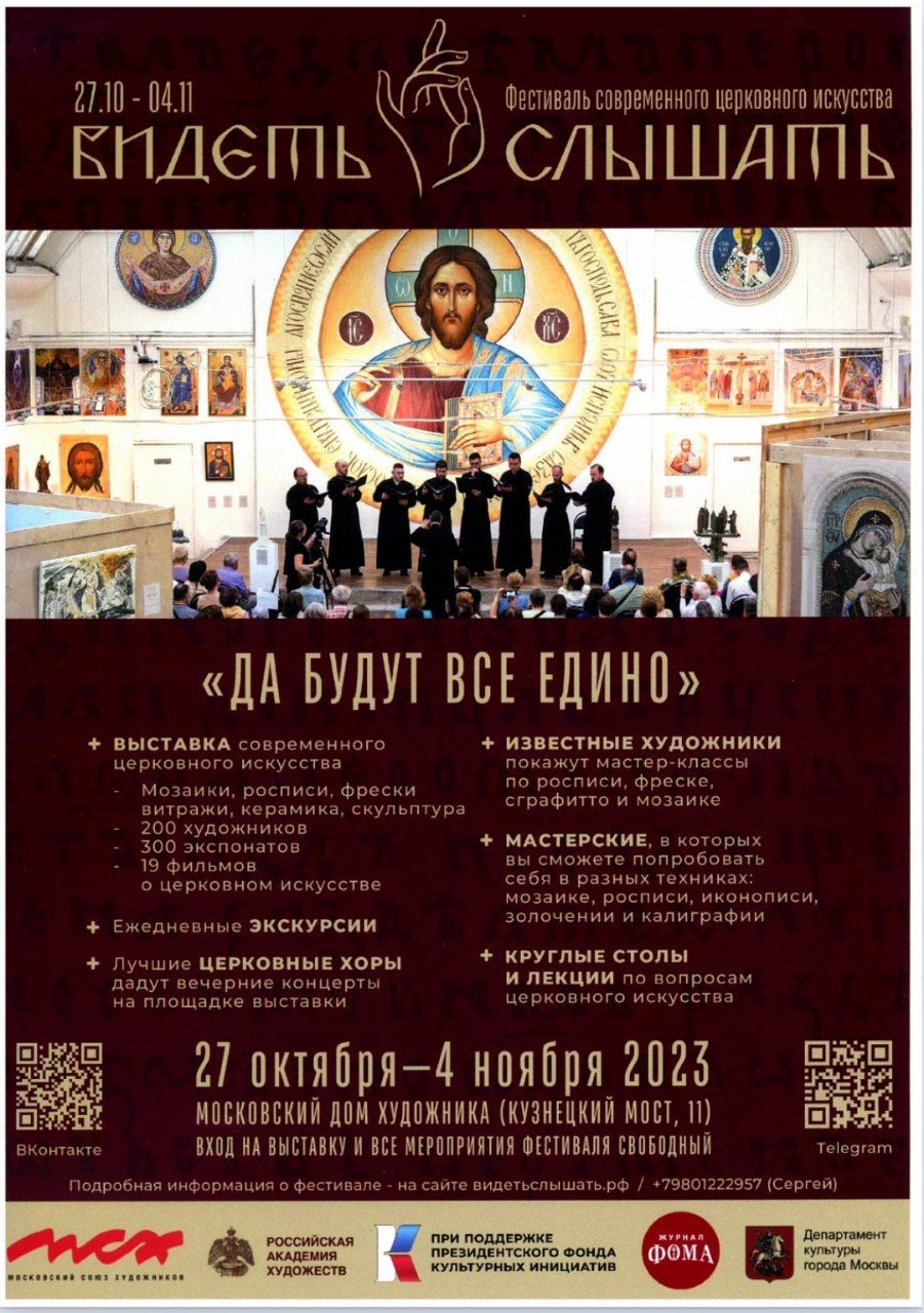 Приглашаем Вас посетить ежегодный Фестиваль современного церковного искусства «ВИДЕТЬ И СЛЫШАТЬ», который будет проходить с 27 октября по 4 ноября 2023 года с 12.00 до 21.00 в выставочном зале Московского Дома художника по адресу: г. Москва, ул. Кузнецкий мост, д. 11, метро Кузнецкий Мост, выход №1.