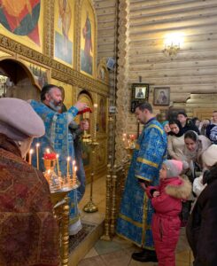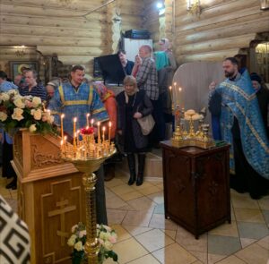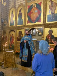 Засту́пнице усе́рдная,/ Ма́ти Го́спода Вы́шняго,/ за всех мо́лиши Сы́на Твоего́ Христа́ Бо́га на́шего,/ и всем твори́ши спасти́ся,/ в держа́вный Твой покро́в прибега́ющим./ Всех нас заступи́, о Госпоже́ Цари́це и Влады́чице,/ и́же в напа́стех и в ско́рбех, и в боле́знех обремене́нных грехи́ мно́гими,/ предстоя́щих и моля́щихся Тебе́ умиле́нною душе́ю/ и сокруше́нным се́рдцем,/ пред пречи́стым Твои́м о́бразом со слеза́ми,/ и невозвра́тно наде́жду иму́щих на Тя,/ избавле́ния  всех зол,/ всем поле́зная да́руй,/ и вся спаси́, Богоро́дице Де́во: // Ты бо еси́ Боже́ственный покро́в рабо́м Твои́м.
