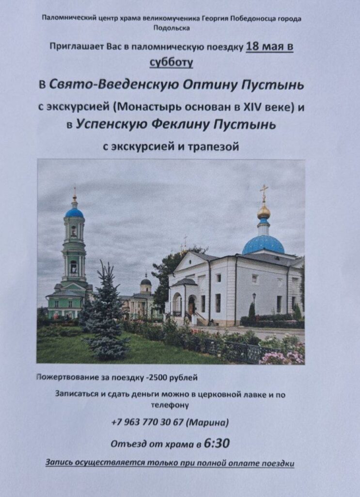 Поездка состоится 18 мая в субботу. Отъезд от храма в 6.30 утра.
