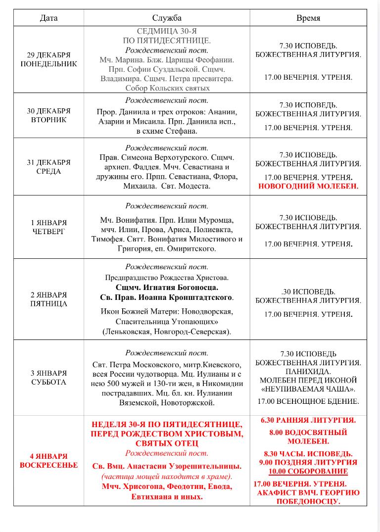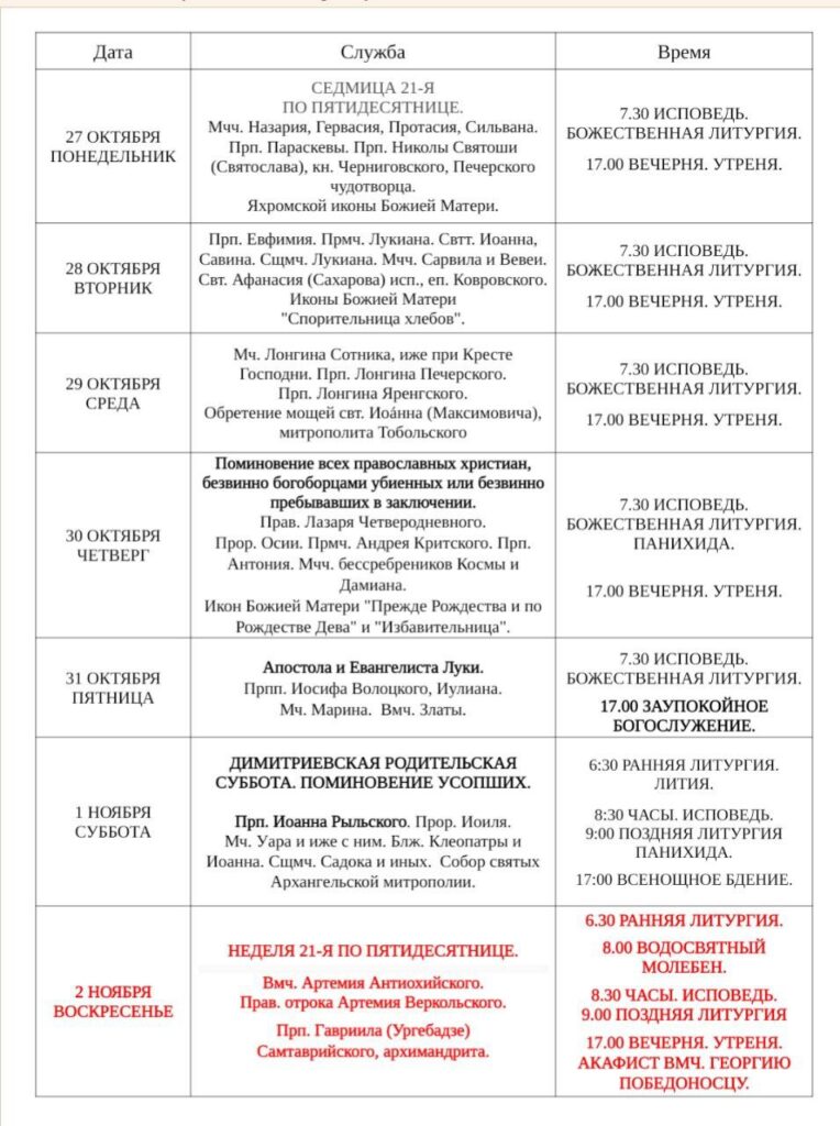 • Добрый день! Расписание служб на все интересующие Вас даты возможно посмотреть в разделе «Расписание Богослужений», стараемся заблаговременно указывать всю необходимую информацию.