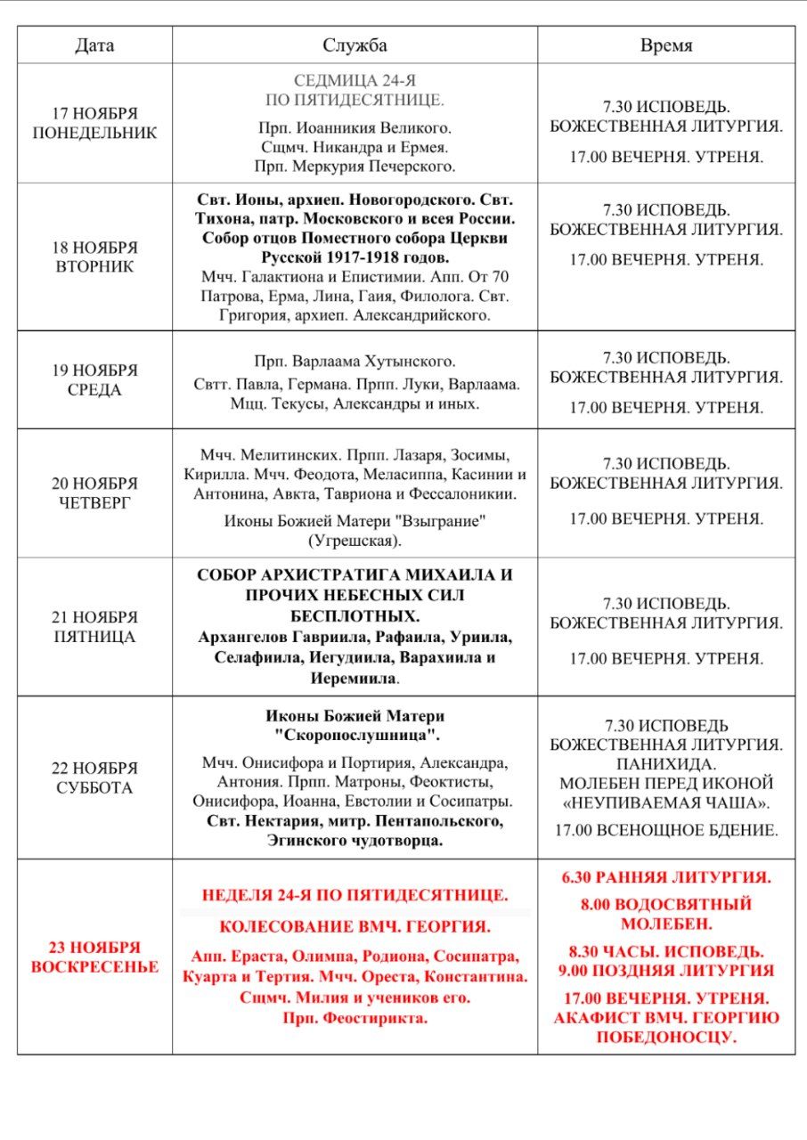 • Здравствуйте! Расписание Богослужений было опубликовано, так как совершались трансляции онлайн на Ютьюб-канале храма и в Инстаграм. Возможно, были технические задержки, простите!