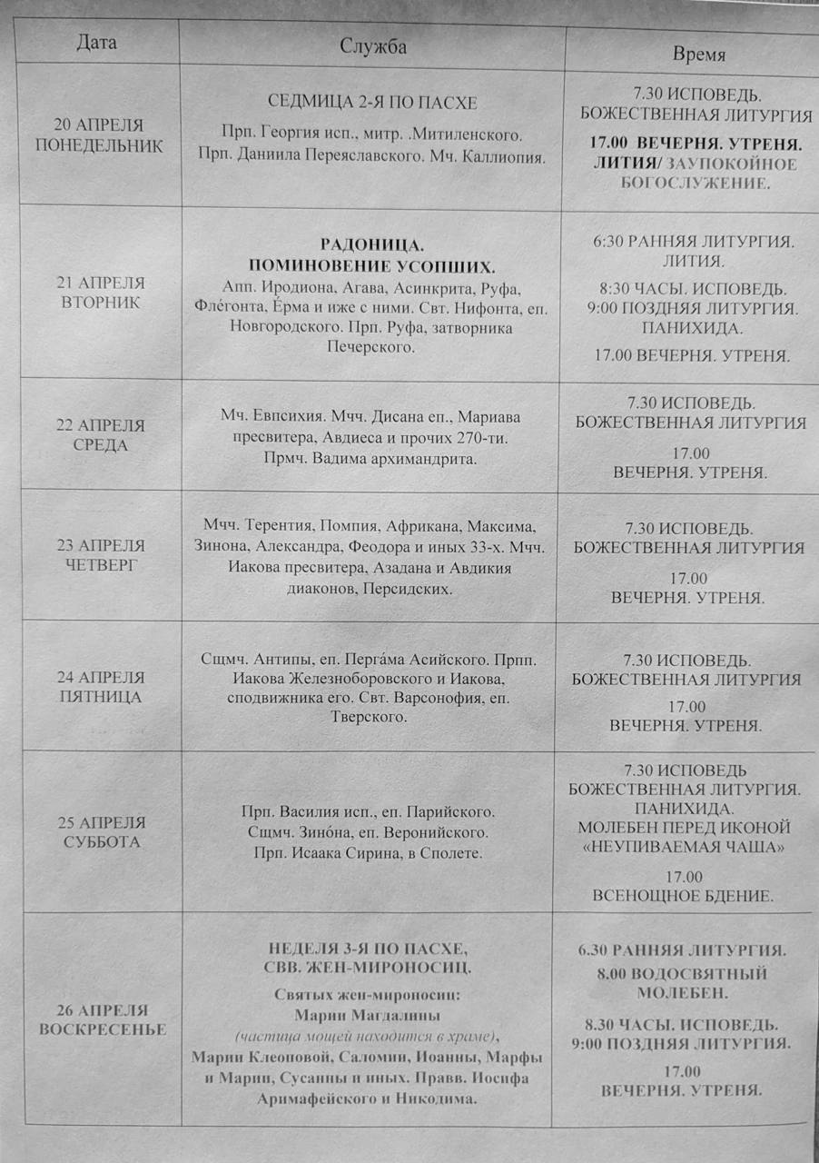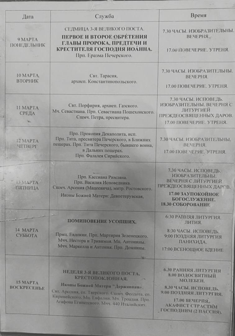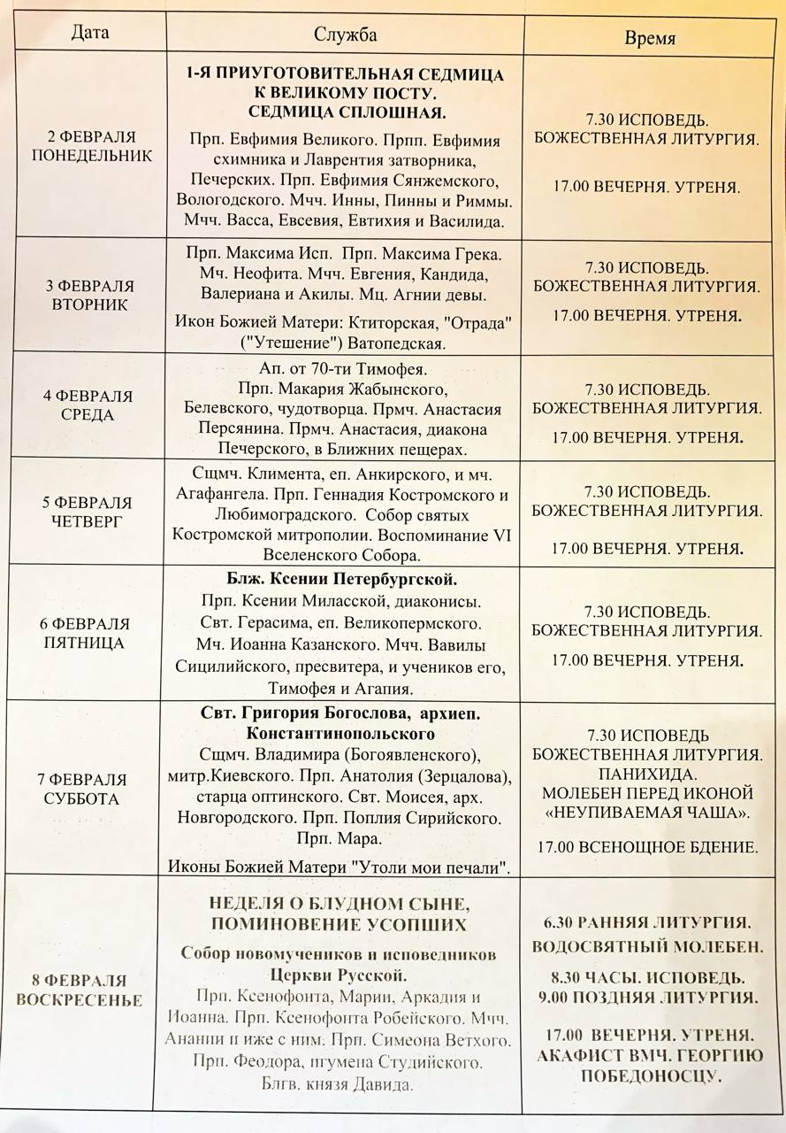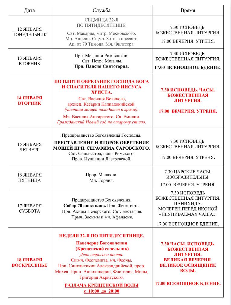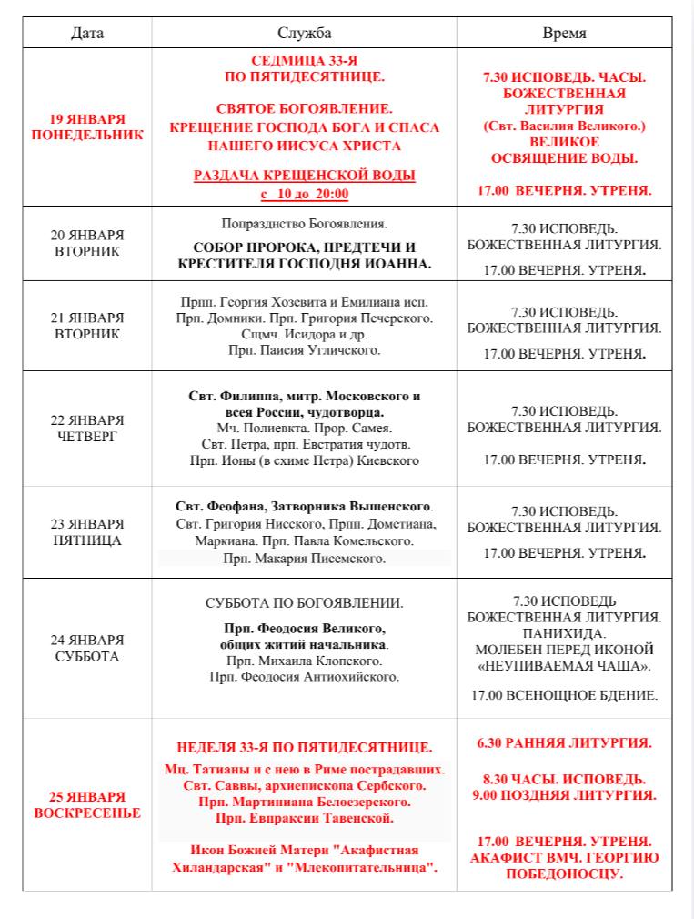 Расписание Богослужений